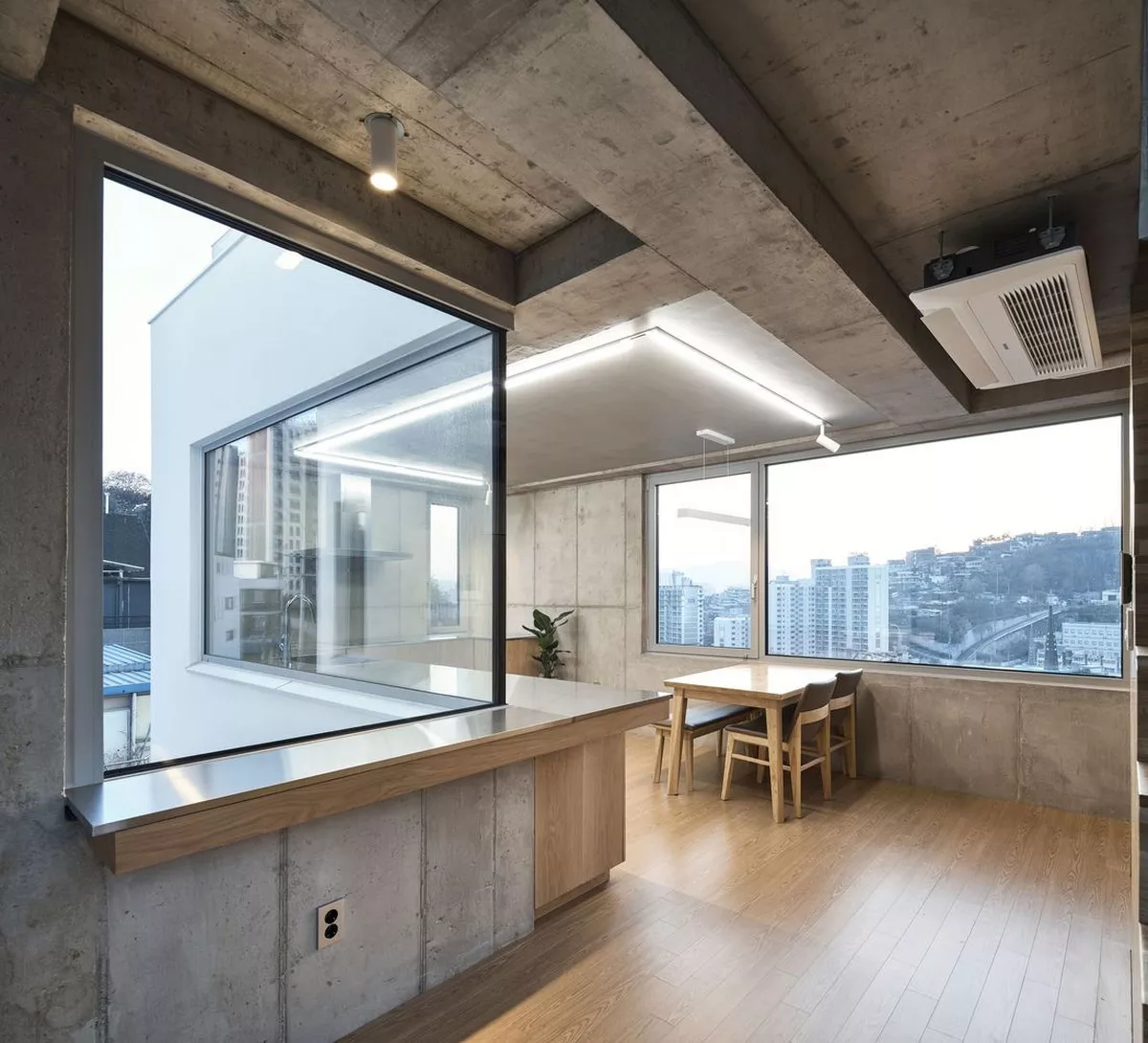 首尔崇仁空间,新型共享住宅。建筑内外从材质和表现手法上有比较大的反差,白色外立面搭配窄边窗,与周边形成鲜明对比。室内以水泥墙面为主,搭配条形灯及木质家私,让空间整洁、舒适,得以最大化的利用空间。